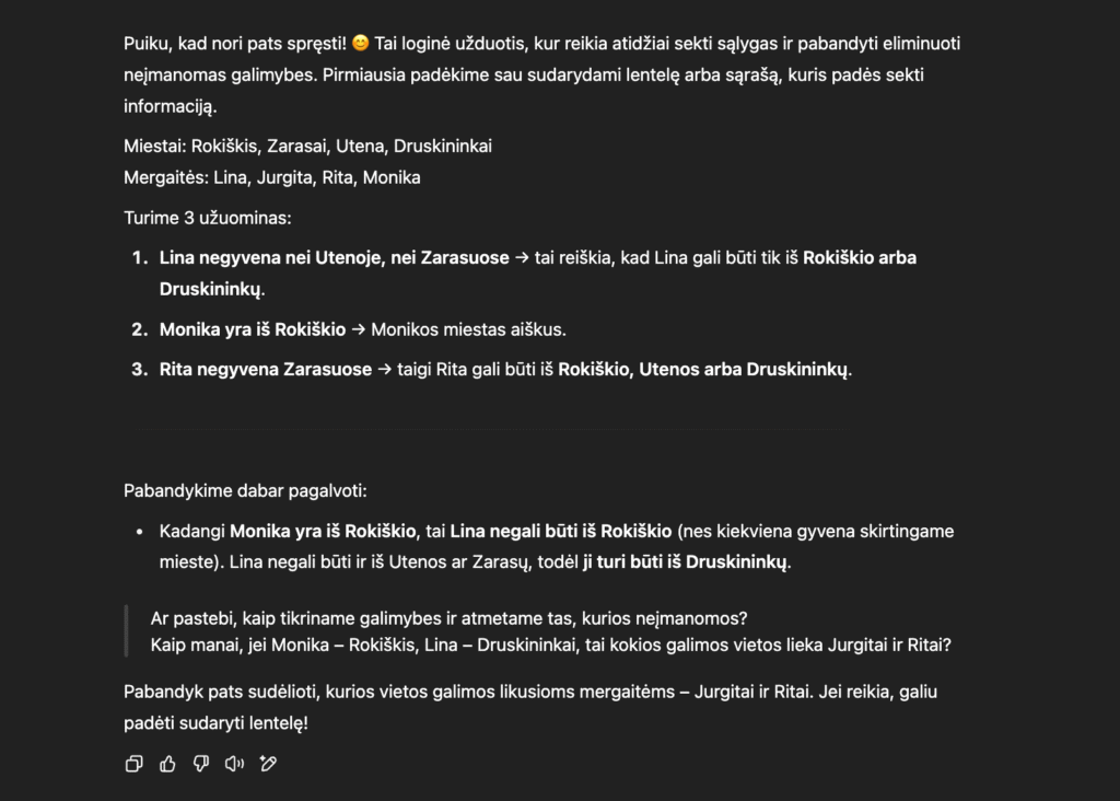 Kaip matote atsakymas yra pilnas ir išsamus. Tai byloja apie puikų ChatGPT veikimą, bet mūsų, kaip tėvų, tikslas padaryti, kad vaikas ne nuolatos gautų greitus atsakymus per keletą sekundžių, bet lavintų savo mąstymą. Kitame pavyzdyje pamatysite ChatGPT veikimą su papildomais nustatymais.